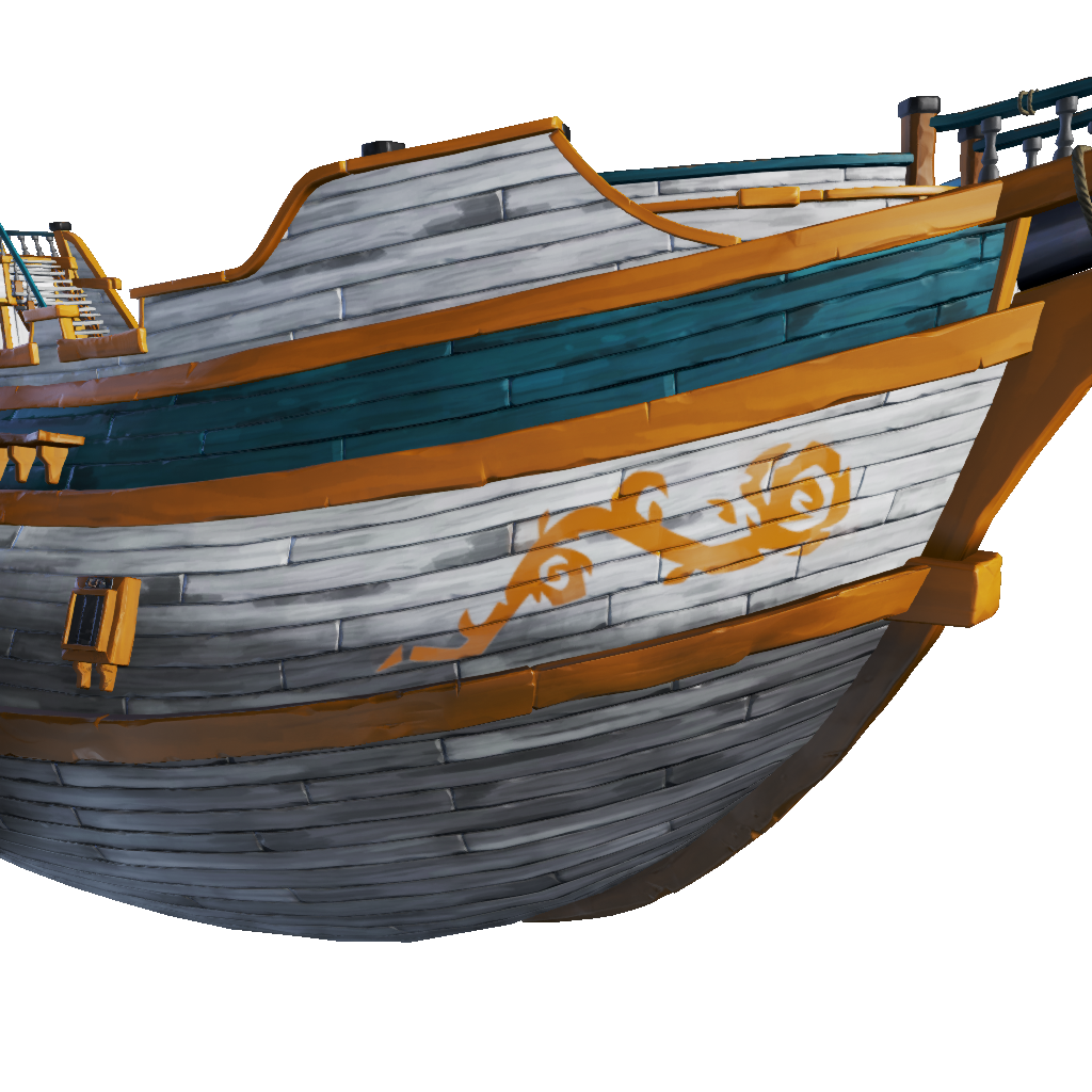 | description | A bright blue and ivory hull with a thorn motif, reminding pirates of that well-known warning about roses. |